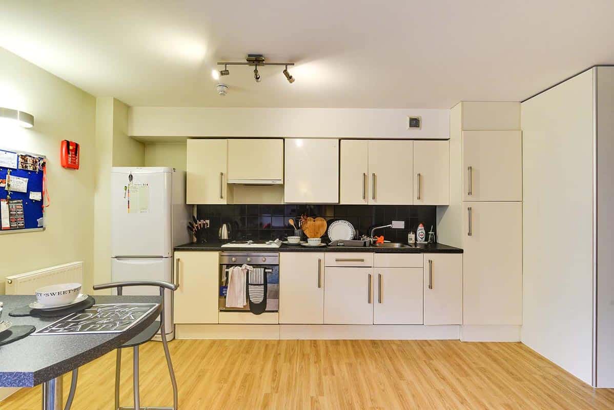 This is a single en-suite studio measuring around 24m². The room has a comfortable double bed, a desk area and private bathroom, as well as a wardrobe and plenty of storage. The studio is fully equipped with a private kitchenette. There is free Wi-Fi in each bedroom and throughout the building.