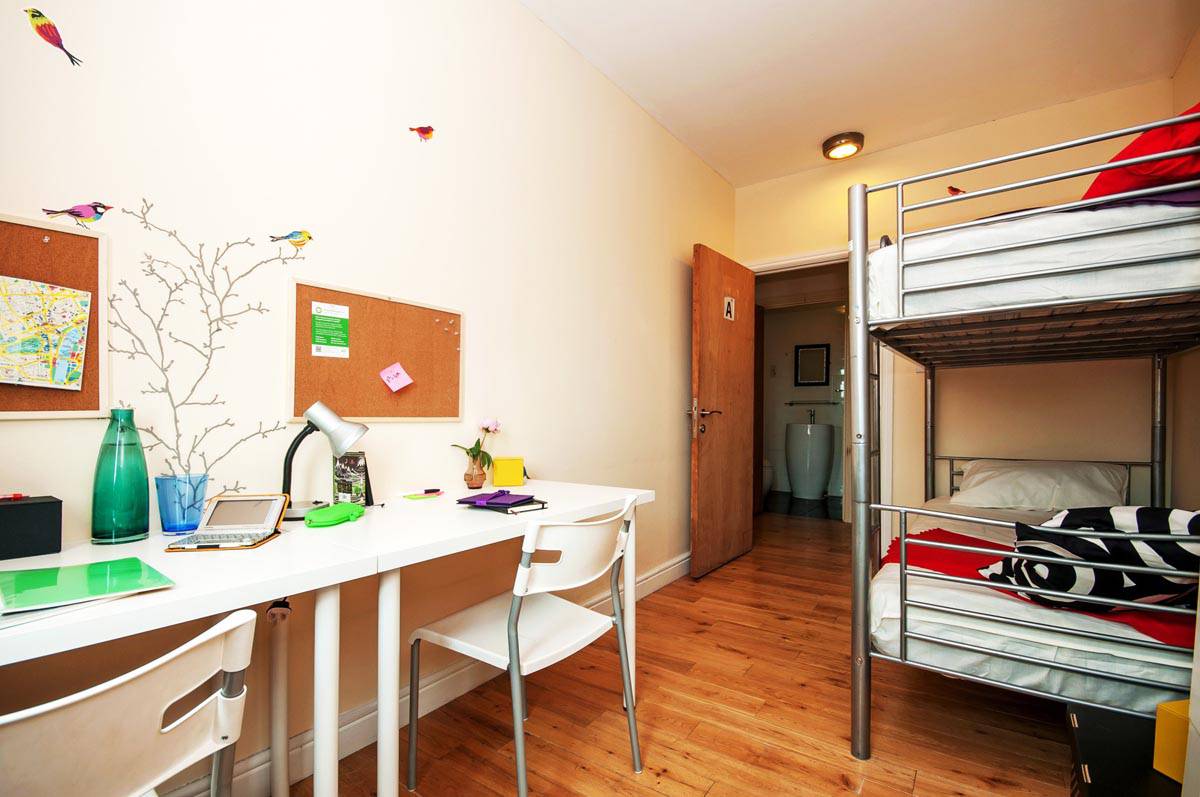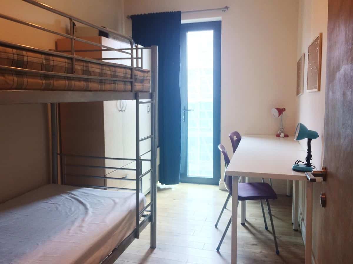This is a twin room, the rooms in this residence on average measure around 9m². The setup tends to consist of two rooms with a twin or a single room and a twin room. The rooms share a fully fitted kitchen and bathroom. The total capacity of the flat is three or four people. There are two different layouts for the twin room; either two single beds on either side of the room, or two single beds in a bunk bed setup.