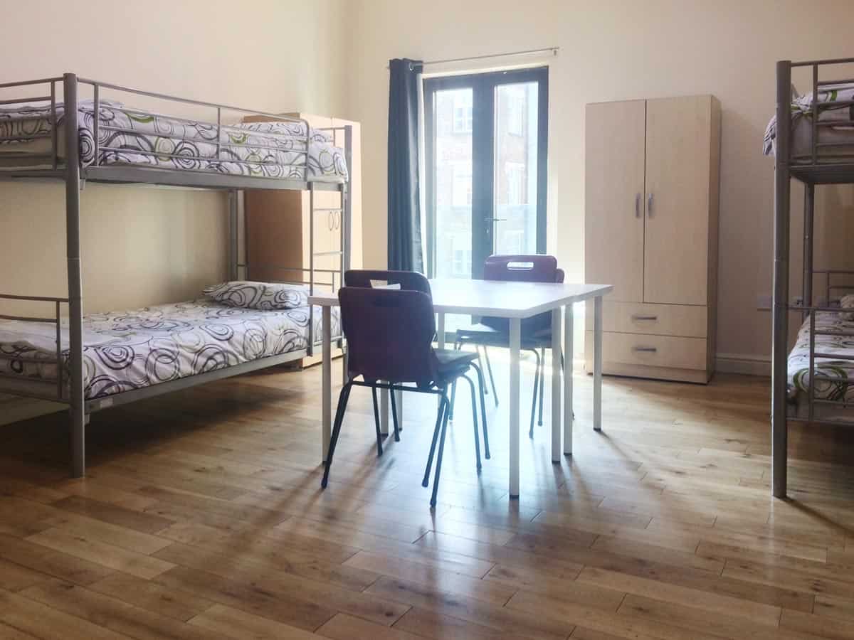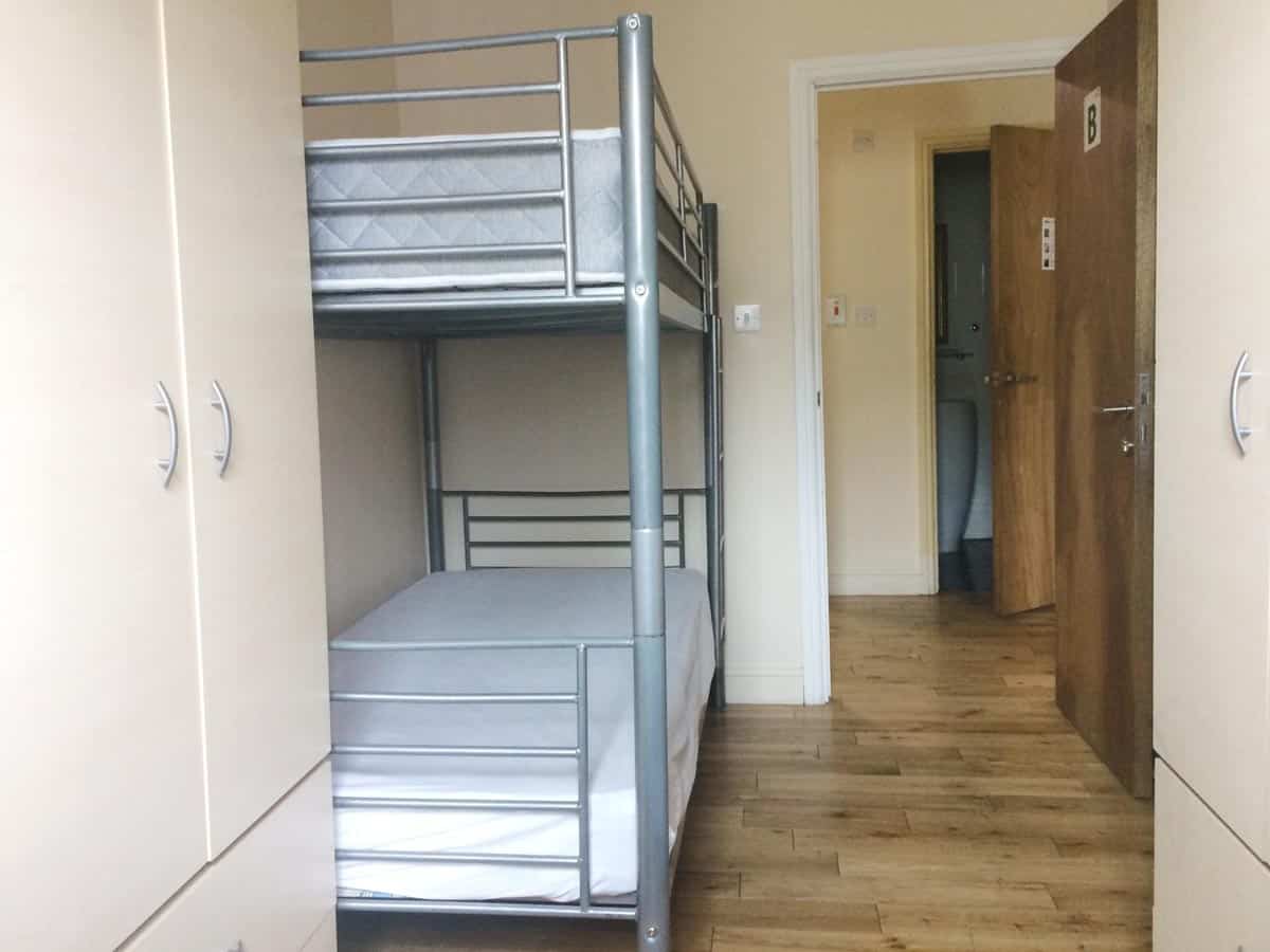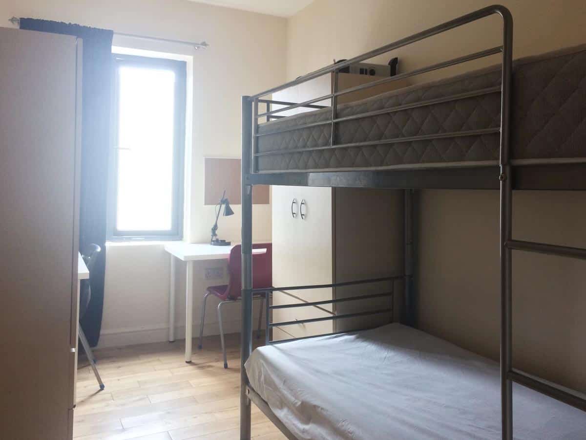 This is an open plan room, the rooms in this residence on average measure around 9m². The setup tends to consist of between four to six single beds which share a fully fitted kitchen and bathroom. The layouts can either be single beds spread out in the room, bunk beds or a combination of the two.