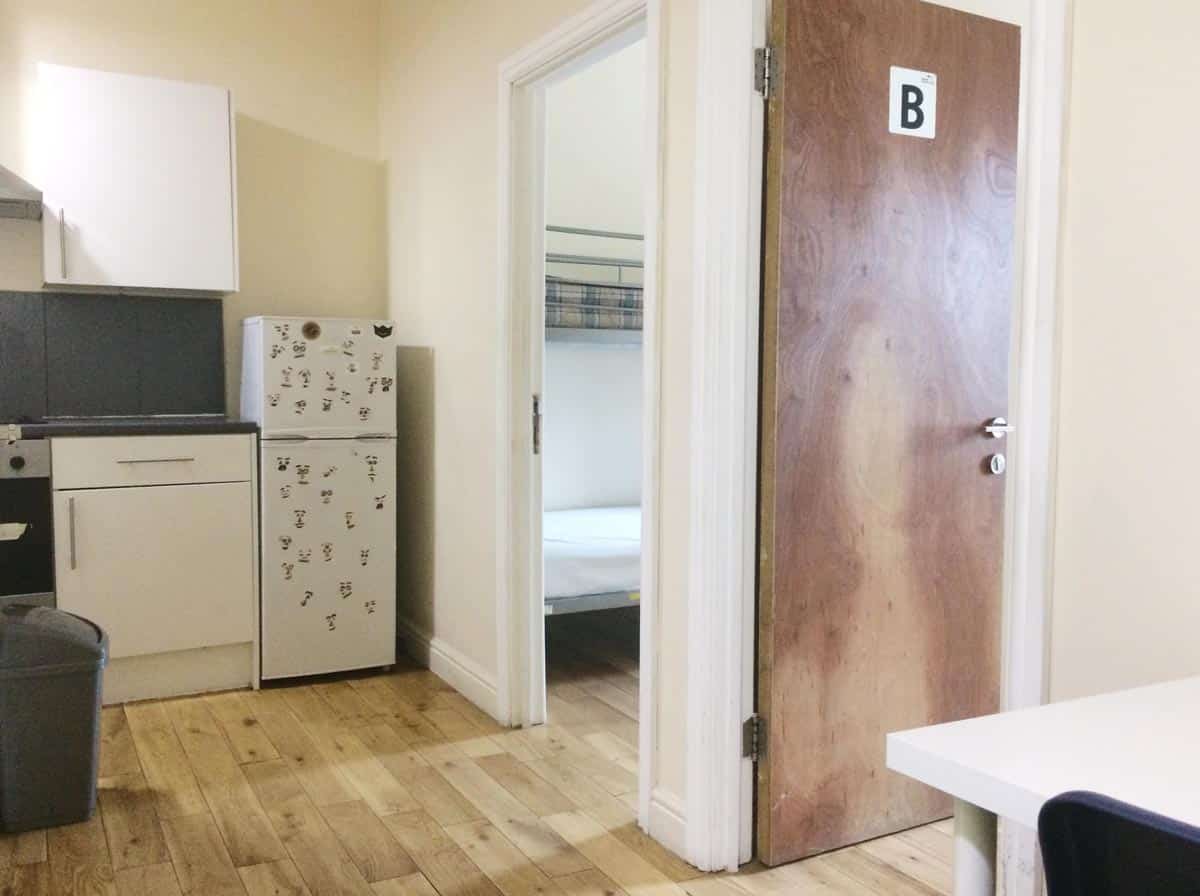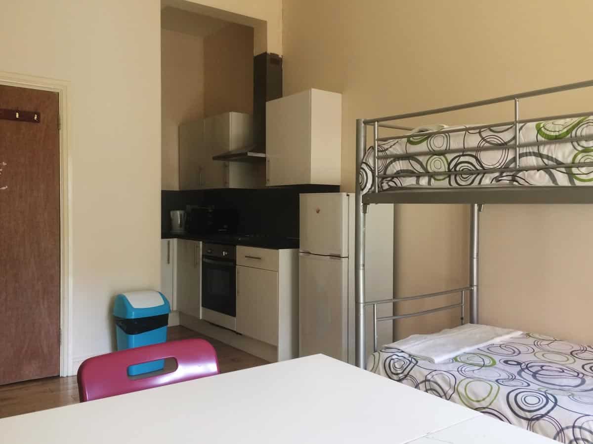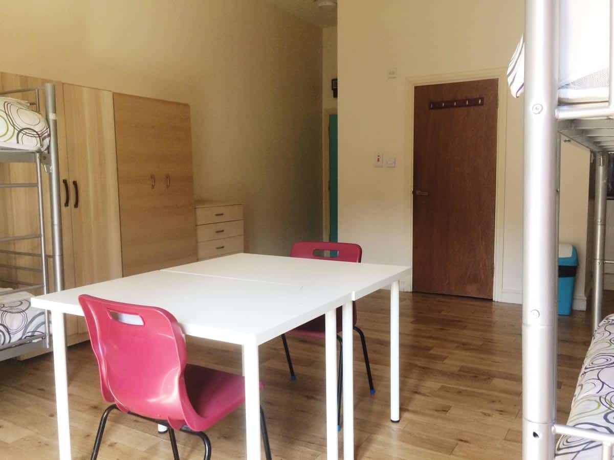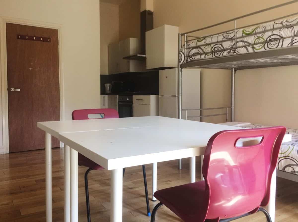 This is an open plan room, the rooms in this residence on average measure around 9m². The setup tends to consist of between four to six single beds which share a fully fitted kitchen and bathroom. The layouts can either be single beds spread out in the room, bunk beds or a combination of the two.