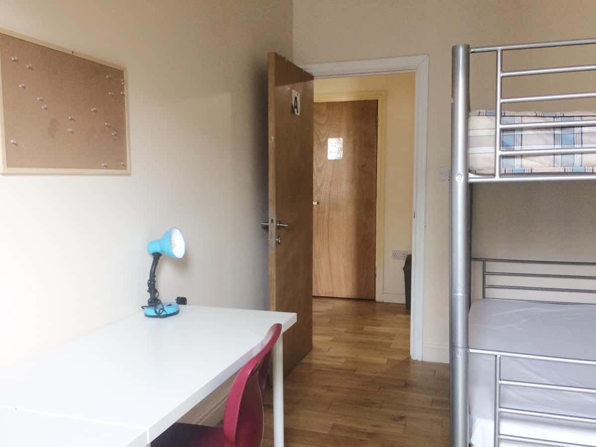 This is a single room, the rooms in this residence on average measure around 9m². The setup tends to consists of two single rooms or one single and one twin who would share a fully fitted kitchen and bathroom. Within the single room, you would find a comfortable single bed, a desk area, as well as a wardrobe. There is free Wi-Fi in each bedroom and throughout the building.