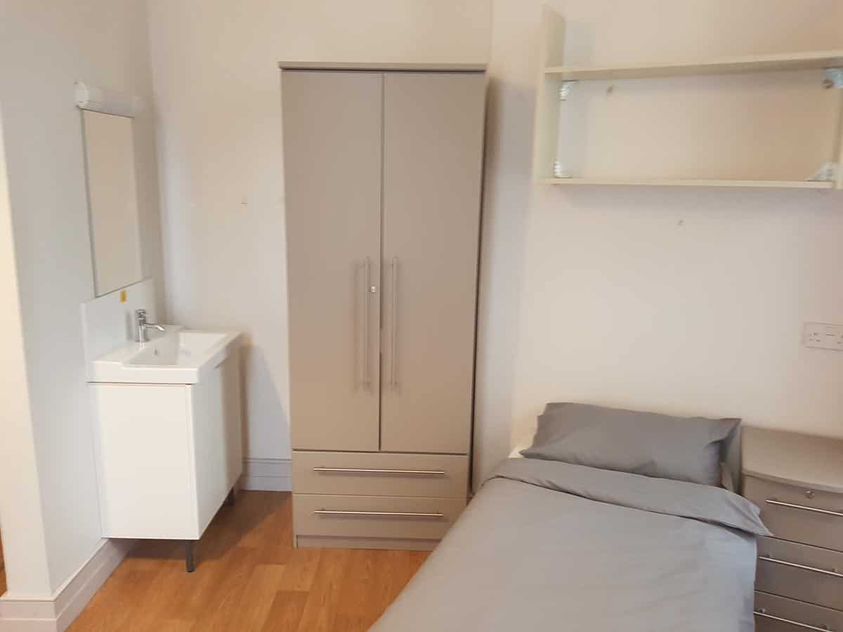 This is a single non en-suite room with access to a shared bathroom and a shared kitchen. The room has a comfortable single bed, a desk area, drawers, as well as a wardrobe and sink with vanity unit. There is free Wi-Fi in each bedroom and throughout the building.