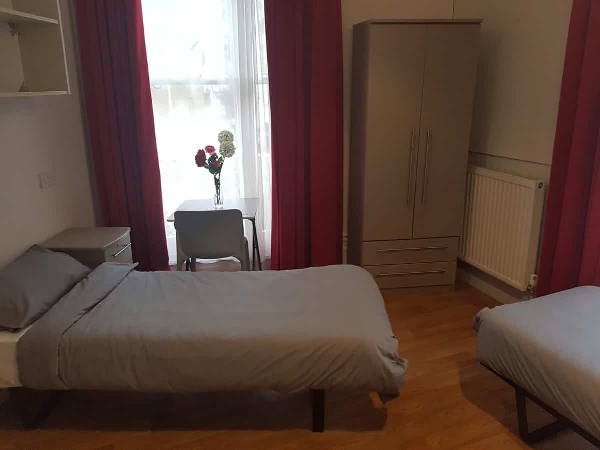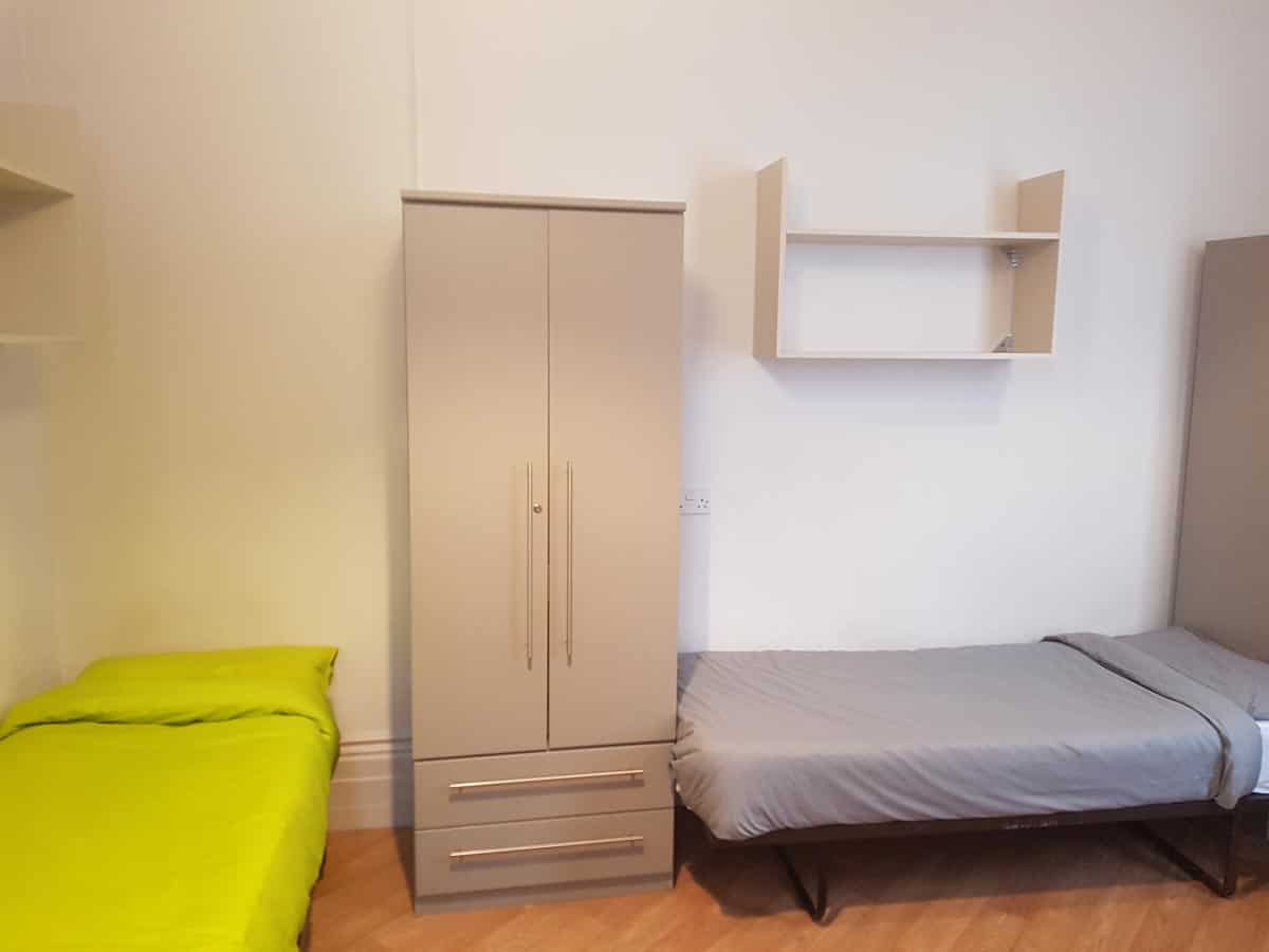 This is a larger non en-suite room with access to a shared bathroom and a shared kitchen. The room has three comfortable single beds, a desk area, drawers, as well as a wardrobe and share a sink with vanity unit. There is free Wi-Fi in each bedroom and throughout the building.