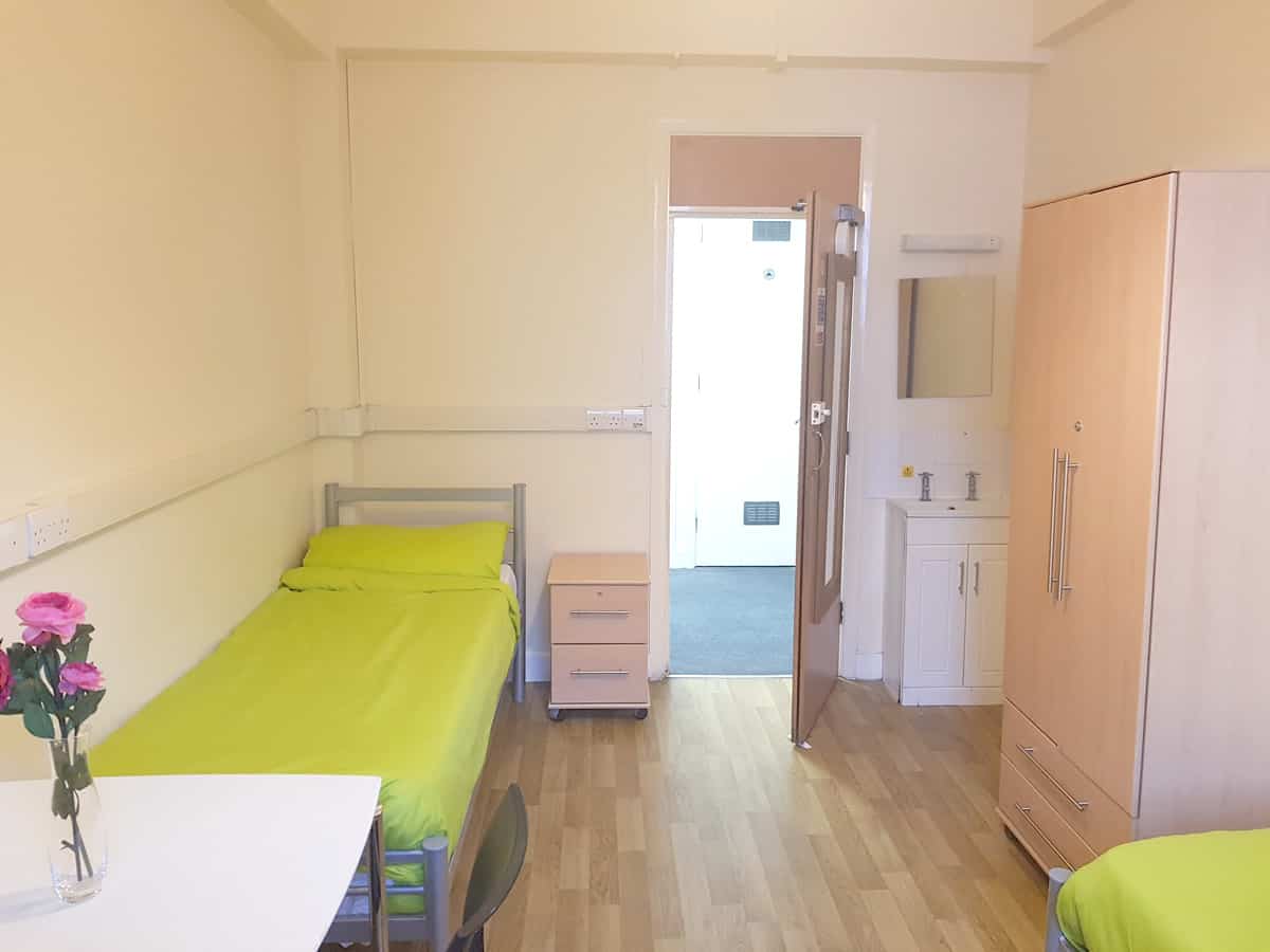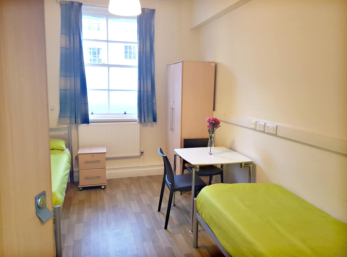 This is a twin bedroom (shared with one other person of the same sex) with access to a shared bathroom. The room has two comfortable single beds and a desk area with chair. There is also storage space for your clothes including a wardrobe, and you will share a sink with shaving and vanity unit. There is free Wi-Fi in each bedroom and throughout the building.