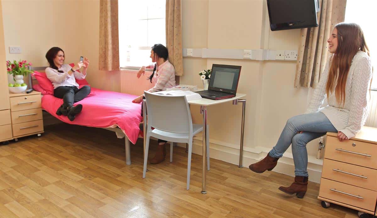 This is a triple bedroom (shared with two other people of the same sex) with access to a shared bathroom. The room has three comfortable single beds and a desk area with chair. There is also storage space for your clothes including a wardrobe, and you will share a sink with shaving and vanity unit. There is free Wi-Fi in each bedroom and throughout the building.