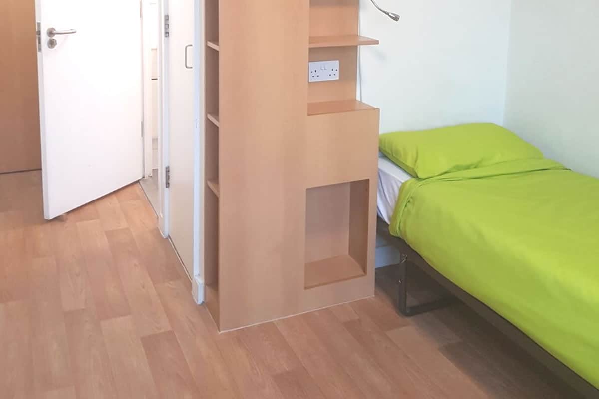 This is a twin room which is perfect for sharing. It comes with an en-suite shower and toilet. The room has two comfortable single beds, a desk area, drawers, as well as a wardrobe, a shared sink with vanity unit and a mini-fridge. There is free Wi-Fi in each bedroom and throughout the building.