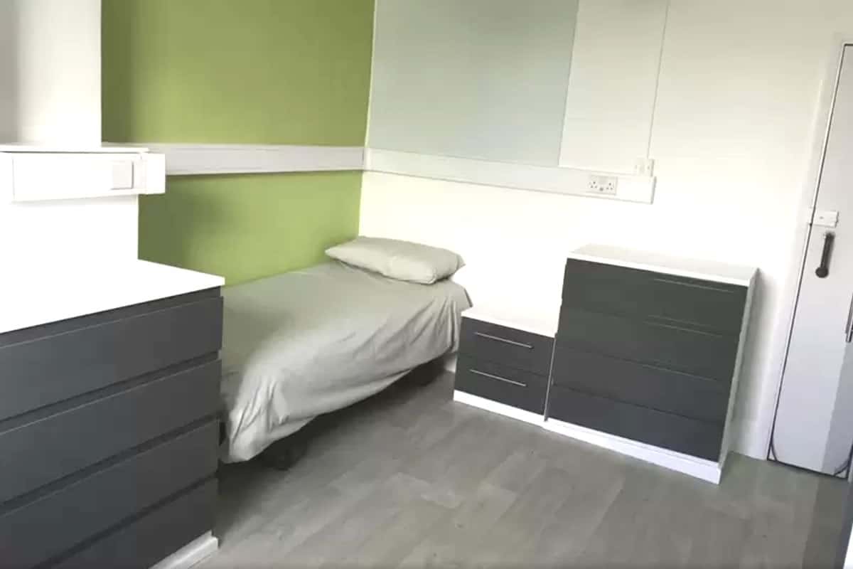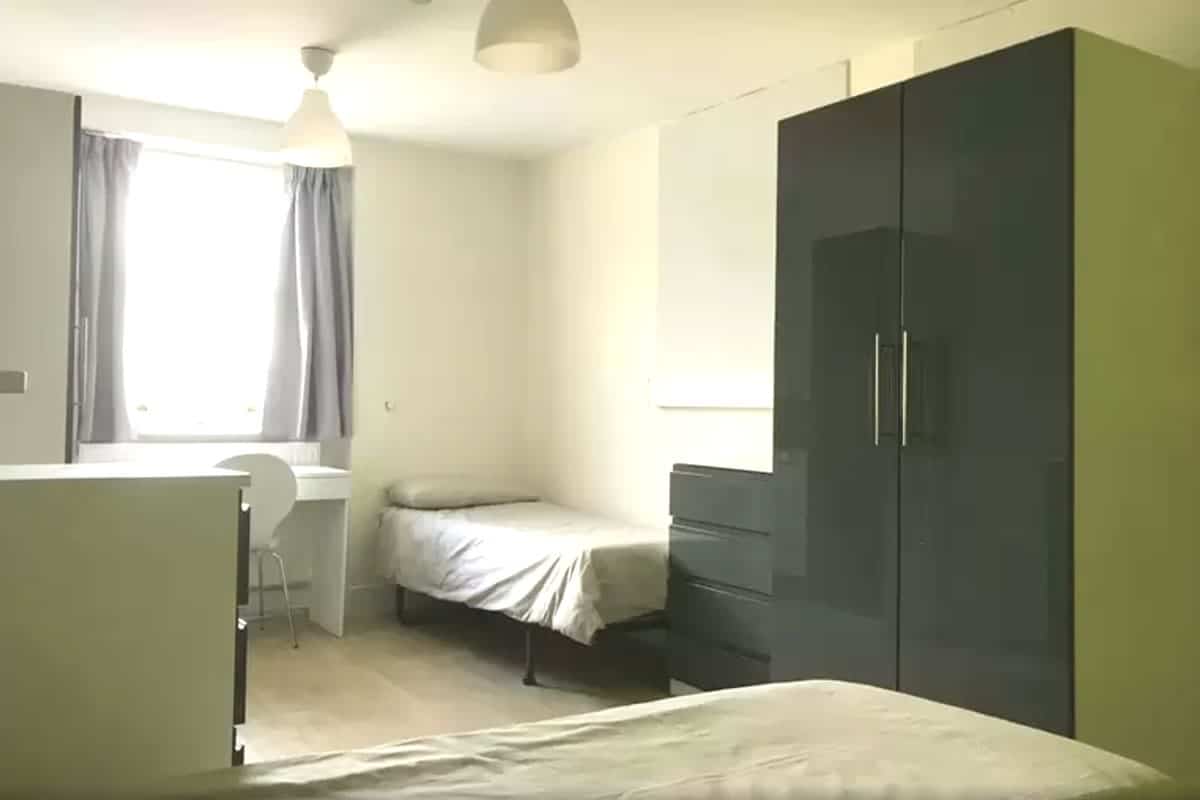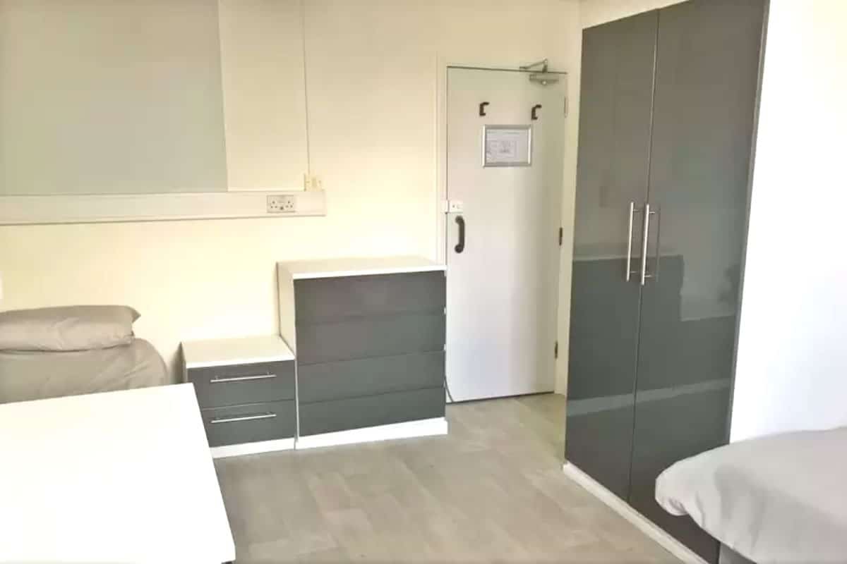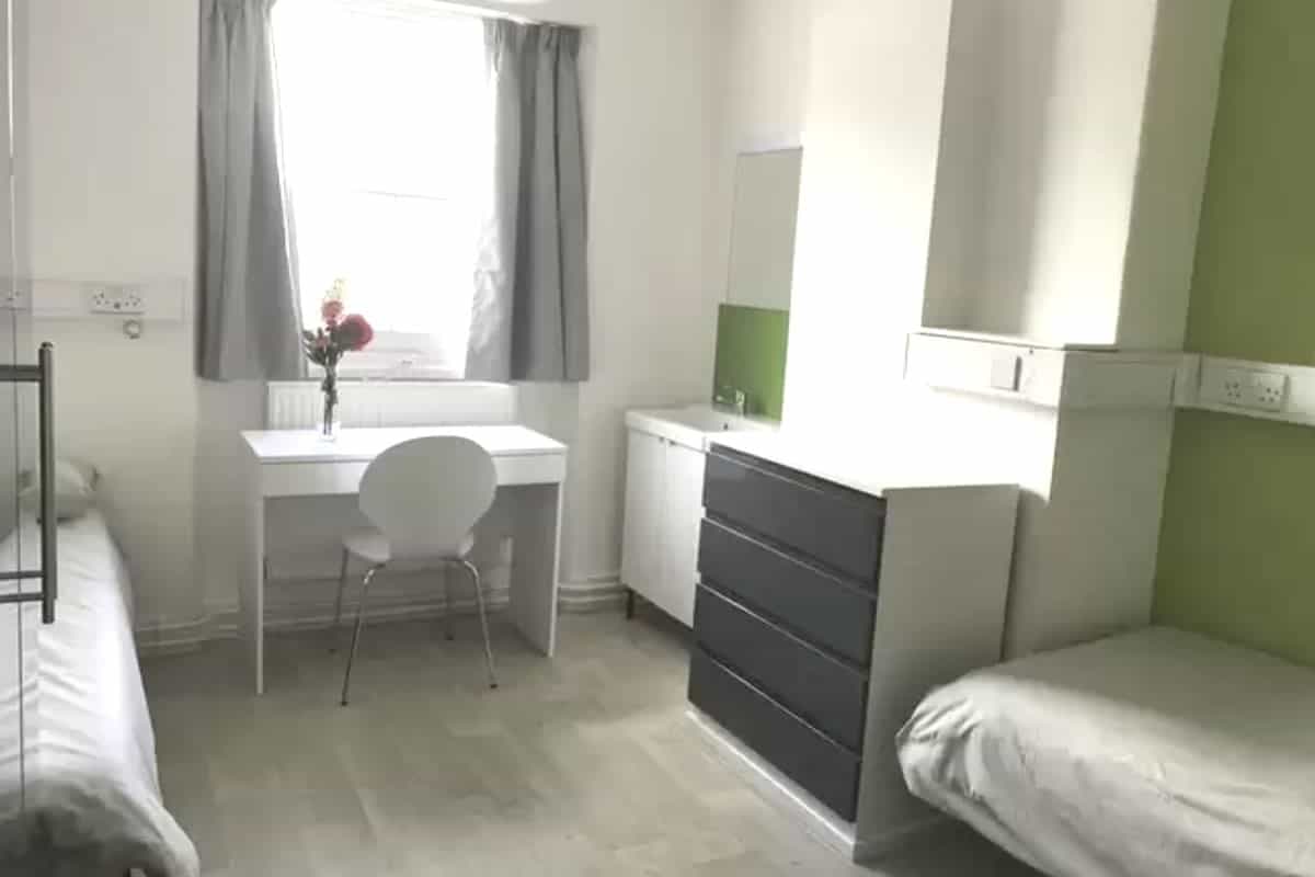 This is a twin non-en-suite room which is perfect for sharing. It comes with access to a shared bathroom and a shared kitchen. The room has two comfortable single beds, wardrobes, drawers and a shared sink with shaving/vanity unit. Each twin room comes with an in-room safe to keep your personal belongs and documents secure. There is free Wi-Fi in each bedroom and throughout the building.