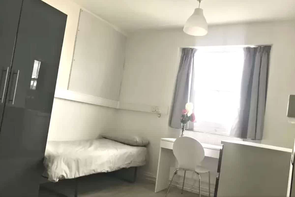 This is a single non-en-suite room with access to a shared bathroom and a shared kitchen. The room has a comfortable single bed, a wardrobe, drawers, and sink with vanity unit. There is free Wi-Fi in each bedroom and throughout the building.