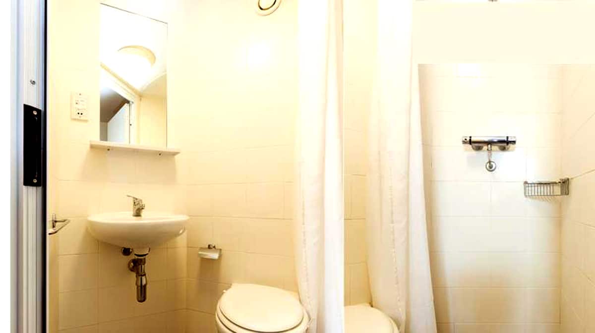 Room shared with someone else of the same sex, each person having a quality bed, wardrobe, drawers and share a sink with shaving and vanity unit. These twins also include a toilet and a shower.